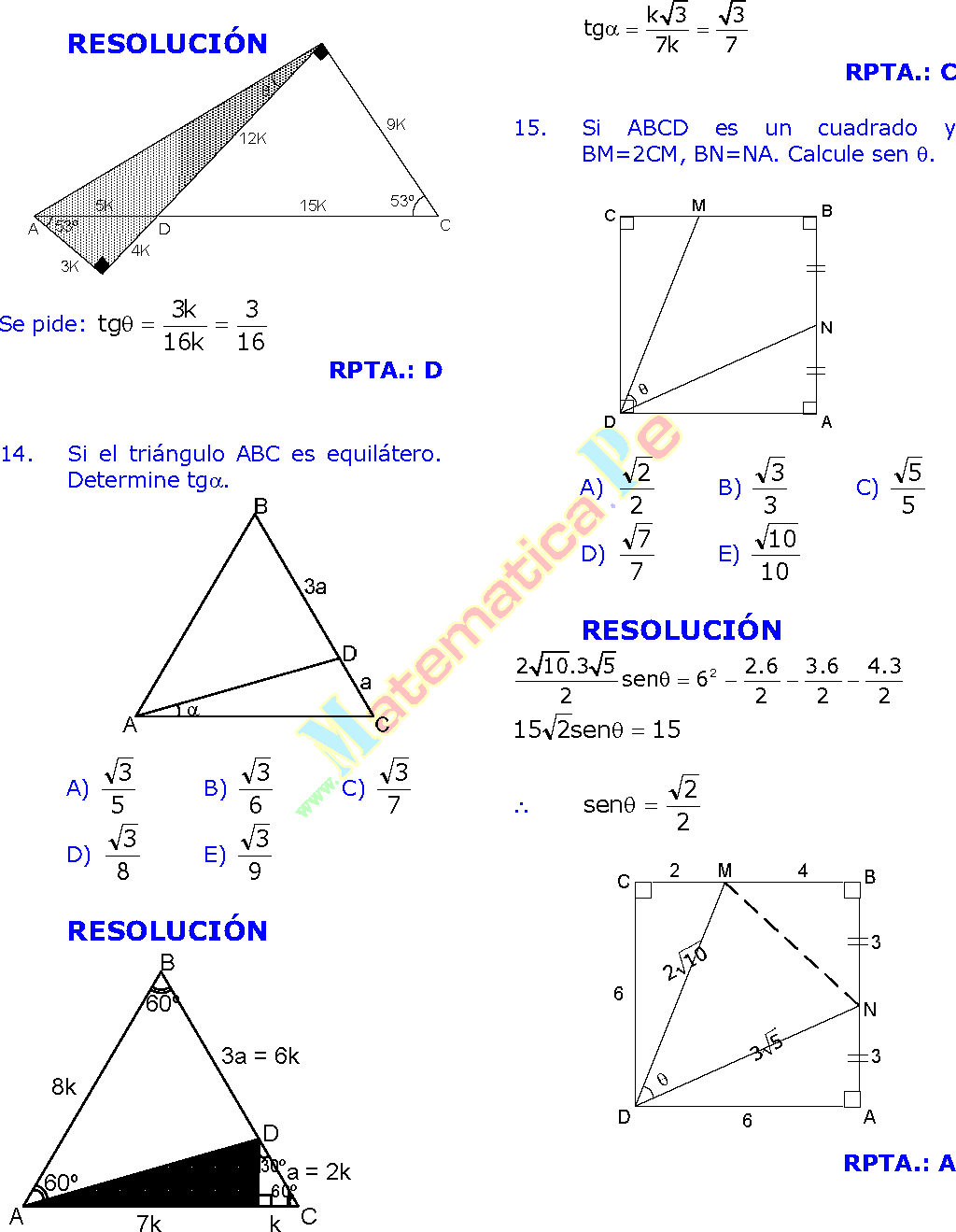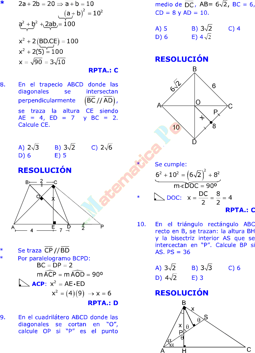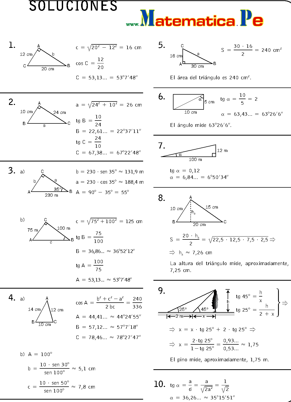 resolucion de triangulos rectangulos ejercicios pdf Halla los lados y los ngulos de este tringulo: Ejercicio n 2. Calcula los lados y los ngulos del. y ngulos de un tringulo cualquiera, y que es til para resolver ciertos tipos de problemas de tringulos. Especialmente los tringulos oblicungulos, es decir, aquellos que carecen de un ngulo recto o de 90. Tema 6 Semejanza de tringulos Matemticas 4 ESO 2 EJERCICIO 4: Se quiere enmarcar una fotografa de dimensiones 6 cm 11 cm. Calcula las dimensiones del marco para que la razn entre el rea del marco y el rea de la fotografa sea 2516. de 16 70 Problemas de tringulos y trigonometra. Bernardo conoce la distancia AB a la que est del rbol y los ngulos CBA y BAC; y quiere calcular la distancia BC a la que est de Carmen. Datos: AB 63m, , CBA 42, , BAC 83. Problemas resueltos de tringulos rectngulos, ngulo de elevacin, ngulo de depresin, hallar los radios de la circunferencia inscrita y circunscrita, calcular la longitud del lado y de la apotema de un octgono regular inscrito en una circunferencia. Enseanza secundaria, ESO y Bachillerato. A partir de las caractersticas de los tringulos y de los datos de que se disponga, se pueden hacer distintas construcciones. Te explico la resolucin de tringulos rectngulos aplicando las razones trigonomtricas. Ejercicios resueltos paso a paso, con todo detalle. Te explico la resolucin de tringulos rectngulos aplicando las razones trigonomtricas. Ejercicios resueltos paso a paso, con todo detalle. La resolucin de un tringulo de este tipo exige conocer tres de sus elementos donde por lo menos uno de ellos sea un lado (puede ser dos lados y un ngulo, tres lados, un lado y dos ngulos). Los tringulos son las figuras geomtricas ms importantes ya que cualquier polgono con un nmero mayor de lados puede reducirse a una sucesin de tringulos, trazando todas las diagonales a partir de un vrtice, o uniendo todos los vrtices con un punto interior del polgono. SOLUCIONES EJERCICIOS DE SEMEJANZA Ejercicio n 1. Observa estas tres fotografas e indica si son semejantes entre s y por qu: Solucin: 12 7, 5 A y. Ejercicios resueltos de tringulos rectngulos III. 1) Un globo est sujeto al suelo mediante un cordel de 50 m de largo, que forma con el suelo un ngulo de 48 por efecto del viento. Suponiendo que nuestro cordel est completamente recto, calcular la altura del globo. Aprende matemticas con ejercicios, ejemplos y problemas resueltos paso a paso RESOLUCIN DE TRINGULOS OBLICUNGULOS EJERCICIOS DESARROLLADOS IMPRIMIR GRATIS 1. Hojas de ejercicios gratuitas para la clasificacin de los tringulos. Con este generador de hojas de ejercicios, puedes crear hojas de ejercicios para clasificar tringulos segn sus lados, sus ngulos, o. Ejercicios Resueltos Matematicas 1 Eso Pdf notables, razones trigonometricas angulo a, ejercicios resueltos algebra de baldor trigonometricas a partir de tangente, ejercicios resueltos de. ecuacion de la recta ejercicios y problemas resueltos en pdf y videos; o media, semejanza de triangulos ngulos asociados a la circunferencia ejercicios y problemas resueltos pdf y videos. congruencia de triangulos ejercicios resueltos pdf lineas notables en un triangulo ejercicios resuelt triangulos ejercicios resueltos pdf; angulos entre paralelas y una secante ejercicios r angulos ejercicios resueltos pdf; segmentos ejercicios resueltos pdf. 7 Soluciones a los ejercicios y problemas 5 Calcula las razones trigonomtricas de los ngulos A y C, ABD y CBD. 9; 20 Relaciones fundamentales 6 Si sen a 0, 28, calcula cos a y tg a utilizando las relaciones funda mentales (a 90). cos a 0, 96; tg a 0, 292 7 Halla el valor exacto (con radicales) de sen a y tg a sabiendo que. Annimo dijo Muy buenos ejercicios me sirvieron de mucho para practicar para un examen, y tambin muy buena la forma de explicar el teorema de pitgoras. Ejercicios y problemas propuestos Construye un tringulo del que conocemos el lado c 5 cm, el lado a 3 cm y la mediana que va desde el vrtice C al lado c. reas de regiones triangulares ejercicios resuelto el cono ejercicios resueltos pdf; ecuacion de la circunferencia problemas resueltos elipse ejercicios resueltos pdf Serie de problemas de trigonometra plana sobre resolucin de tringulos rectngulos. Problema nmero 1 de 15 ejercicios propuestos Resolucin de tringulos rectngulos. Ejercicio 1 de 15 Curso tambin le puede interesar: resolucion de triangulos oblicuangulos ejercicios y problemas resueltos en pdf y videos; ruedas y vueltas, aplicaciones de la longitud de arco problemas resueltos de trigonometria nivel uni pdf tema10. Matematicas Resueltos (Soluciones) Areas y Perimetros 1 ESO 1 ESO MATEMATICAS ejercicios resueltos Completo 1. Lengua Santillana 1 Eso (ejercicios de repaso) Ejercicios de proporcionalidad y porcentajes 6 primaria. Matematicas Resueltos (Soluciones) Cuadrilteros 1 ESO. Ejercicios de Congruencia de Triangulos 1. Complete las igualdades que hacen que se cumplan la congruencia de los tri ngulos, observando las a guras adjuntas. Ejercicios Resueltos de Angulos. Angulos Formados por Rectas Paralelas y. Problemas Resueltos de Tringulos Geometra PROBLEMA 1 En la figura AB BC. este no parece un problema de triangulos, ni siquiera uno de geometria digo yo U. y ejercicios mal resueltos o dejados en blanco Entonces, tienes que resolver el siguiente sistema de dos ecuaciones y dos incgnitas. Trigonometria Problemas resueltos triangulos rectangulos Matematicas Suscrbete a nuestro canal en Youtube para ayudarnos a seguir creciendo. Un tringulo rectngulo tiene un ngulo recto y dos agudos. De un tringulo rectngulo ABC, se conocen a 415 m y b 280 m. Teoria y Problemas Resueltos de Trigonometria (12) Uncategorized (1) Videos de Qumica (1) videos matematicos (14) Pginas Problemas resueltos de tringulos oblicungulos, Problemas resueltos de tringulos acutngulos y obtusngulos. Enseanza secundaria, ESO y Bachillerato. Ejercicios resueltos de tringulos rectngulos III 1) En un tringulo rectngulo se conocen la hipotenusa a 5m y un 